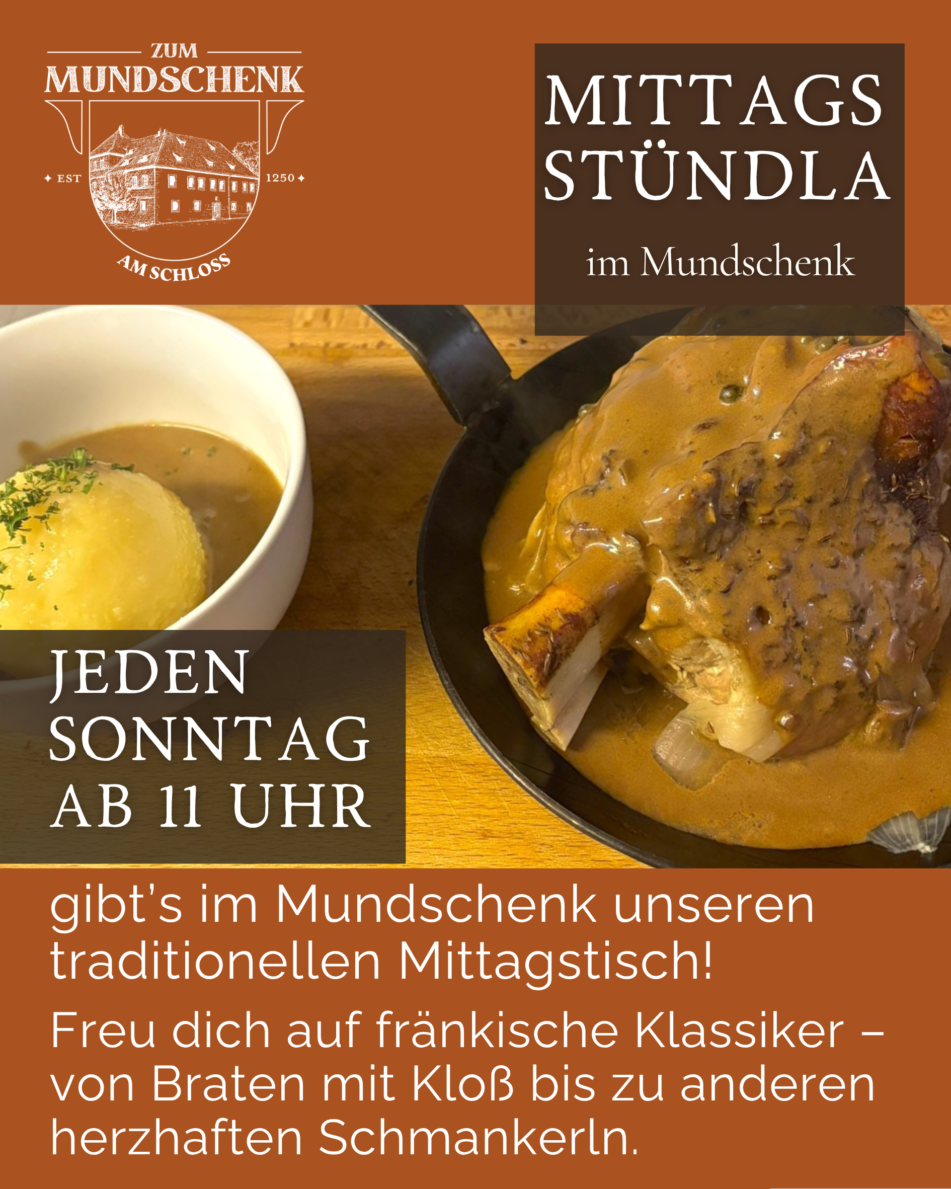 Im Mundschenk steht die fränkische Küche im Mittelpunkt: saftige Braten, klassische Klöße, aromatische Soßen und frische Beilagen – alles hausgemacht, regional und mit Liebe zubereitet. Jeder Teller erzählt ein Stück Heimat und lädt dazu ein, die traditionellen Aromen Frankens zu genießen.