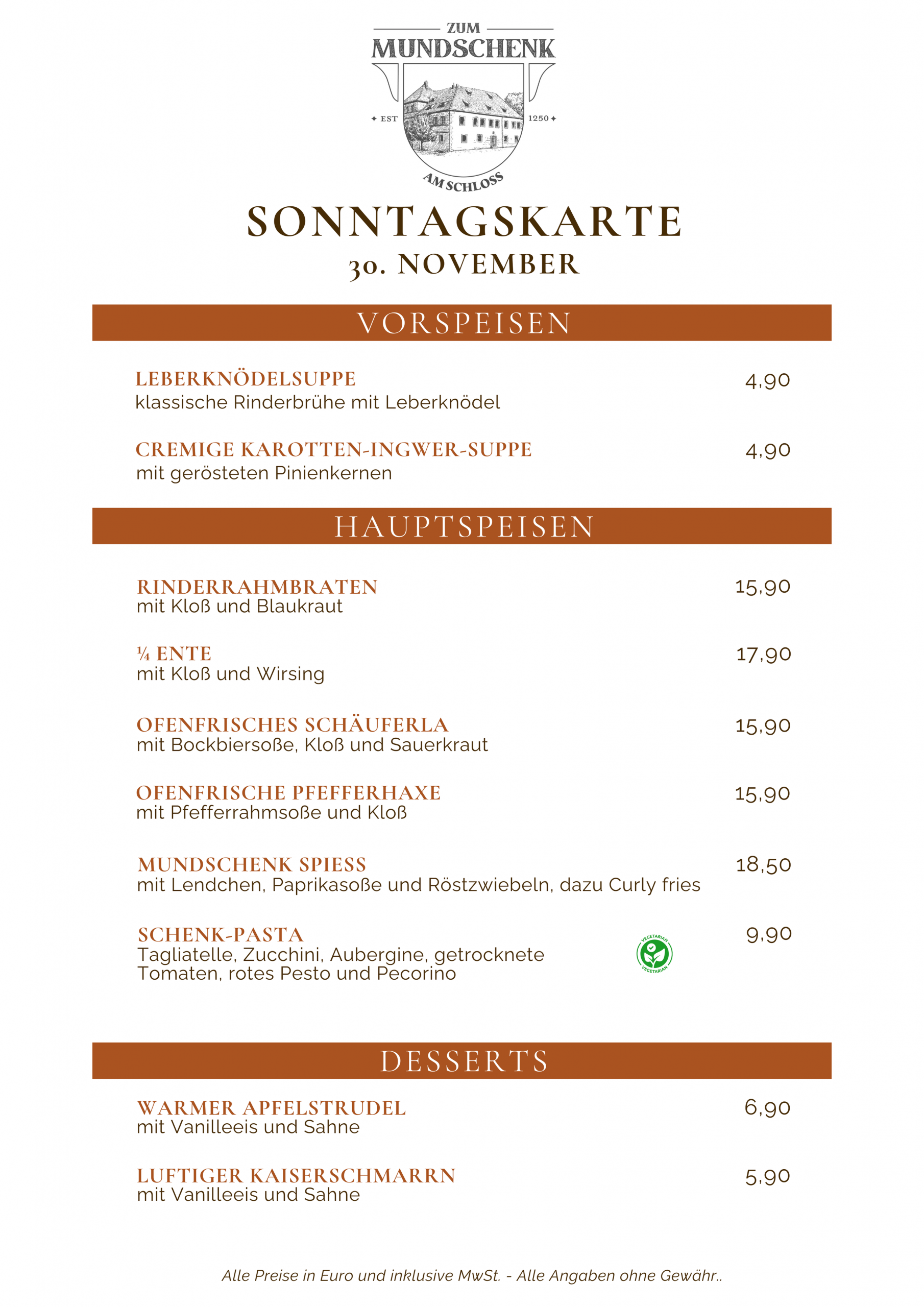 Neben unserer regulären SPEISEKARTE bieten wir auch eine TAGESKARTE sowie eine SONNTAGSKARTE an.